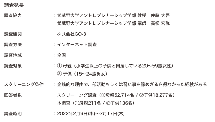 経済状況を理由に部活や習い事を辞めざるを得ない子どもと保護者の実態調査を実施。
