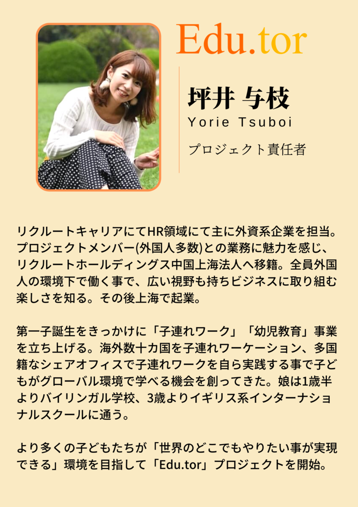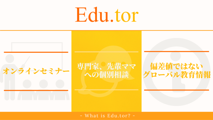 大切な我が子に、未来を支える子どもたちに、「世界中のどこでも やりたいことを実現できる教育」を与えたいパパママを応援するプロジェクト。グローバル教育に関する悩みを持つ方からの相談にこたえるべく先輩パパママや専門家にチューターとなっていただきオンライン個別相談をマッチングすることから始まり、現在はオンラインセミナーや座談会も開催。今後は学校や習いごと情報をEdu.tor独自の「グローバル教育指標」で評価・ランキングし、保護者や関係者のコメントも掲載することで実際に通っている子どもたちの学校生活を知ることができるサイトも構築すべく計画中。これらのサイト・サービスを総称して【Edu.tor】と呼んでいます。