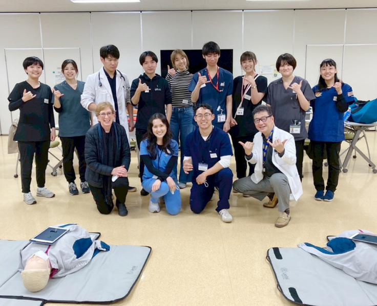 ハワイ大学の4年生2名を迎え、BLS(一次救命処置)と気管挿管 をテーマに、愛媛大学の医学部生7名、歯科の研修医3名が参加しました。