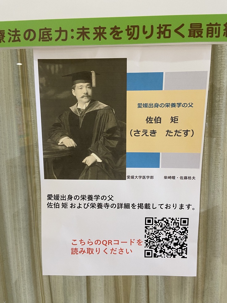 会場には、愛媛出身で「栄養学の父」と言われた、佐伯ただす先生について知れるQRコードが展示されました。