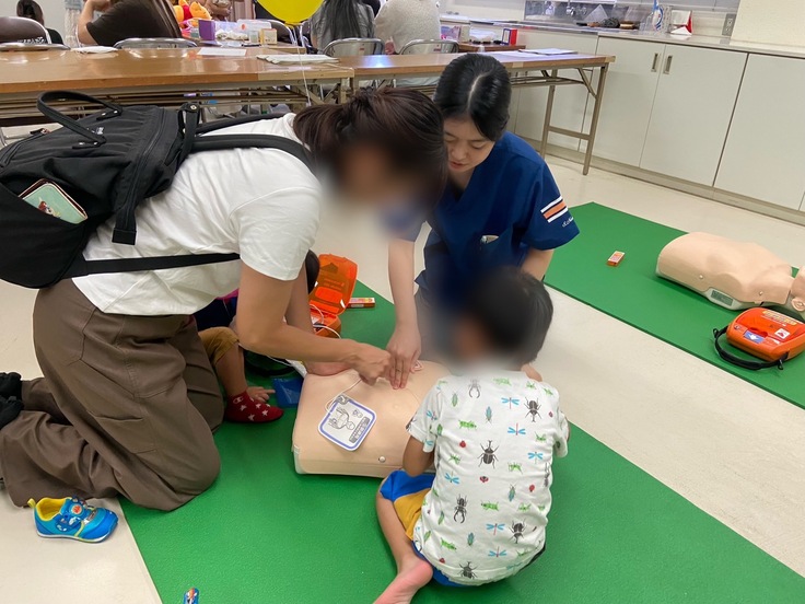 私たちは来場者の方にBLS(胸骨圧迫・AED)を体験してもらうブースを担当。