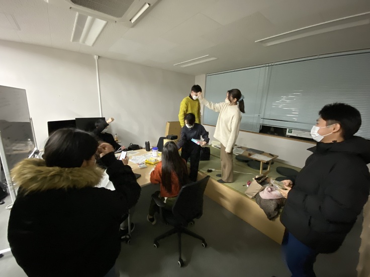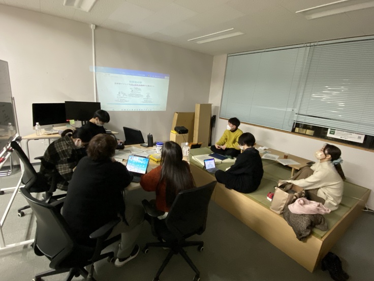スクリーン裏から、1年生らの活動を見守る旧塾長(クラファン実施者)。