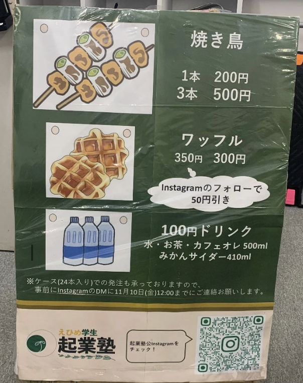 2023年11月11日(土)12日(日)に行われた愛媛大学の学生祭に飲食出店を行いました。学生祭プロジェクトは5月末から動いており、起業塾5期生11名で約半年間、様々な準備を行ってきました。