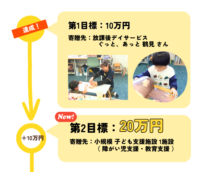 当初の目標【10万円】に、さらに【+10万円】の追加資金で、寄贈先を増やすことを実現します。※寄贈は1カ所あたり10万円を1単位とします(詳細は本文「資金の使途」を参照)