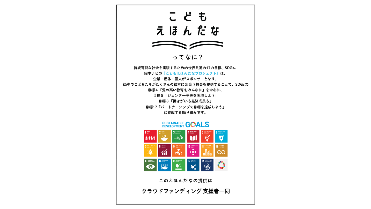■ 紹介ポスター 1枚。「こどもえほだな」まわりに掲示いただく、本プロジェクトの趣旨を記載したポスター。”クラウドファンディング支援者一同”と入れさせていただきました。