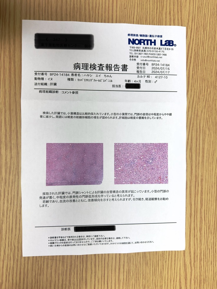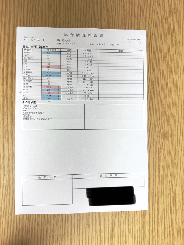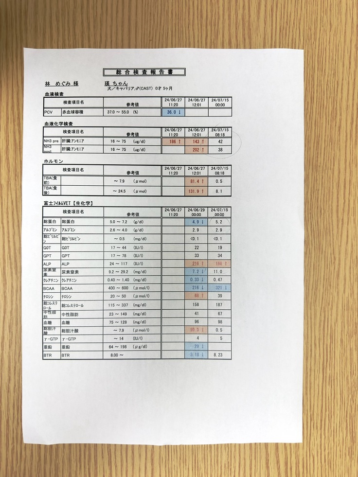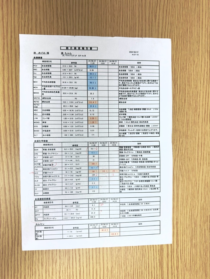 去勢・陰嚢ヘルニア・臍ヘルニア手術の術前の血液検査を受けました。血液検査の結果、NH3(アンモニア)の数値が上限75に対して186と基準値を高く上回ってました。門脈体循環シャントを疑ってさらに血液検査をしていただきTBA(総胆汁酸)も食前・食後で基準値を高く上回ってました。