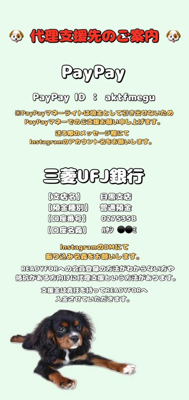 4月に2頭のお迎えで出費しこの高額の治療費がかかり、本職の休日でこの7月から副業を始めましたが通院等もありお恥ずかしながら援助していただけると幸いです。