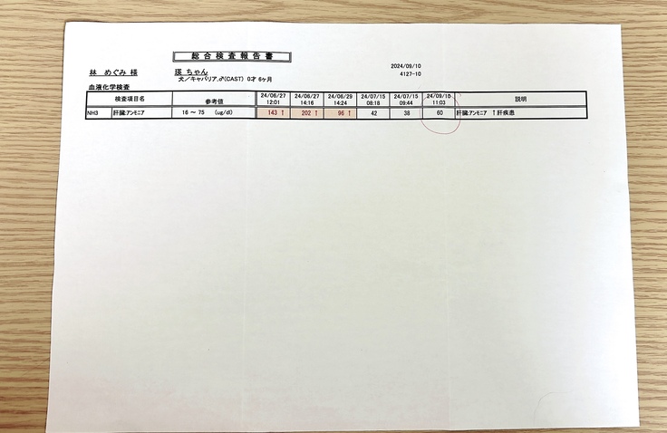 食後2時間での血液検査のアンモニアの数値も正常範囲で良好でした!