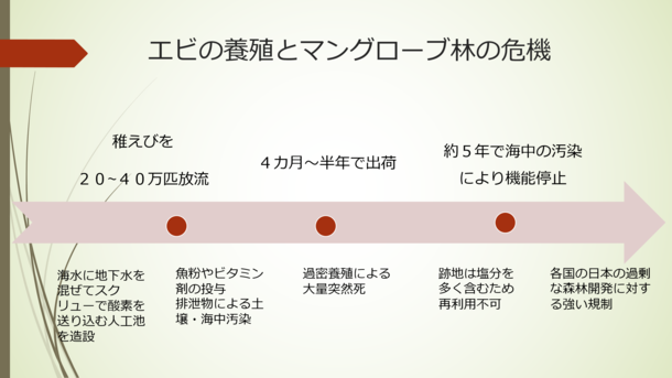 マングローブでのエビの養殖はマングローブ林を残したまま行われるのではありません。最初に大規模に森林を切り倒してから行います。そのため、正常な生態系を長く保つことができずにエビの養殖自体も困難になるのです。