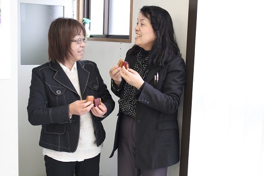 ミニランドセルの完成に喜ぶ、浜尾清恵さん(左)と益子喜代子さん