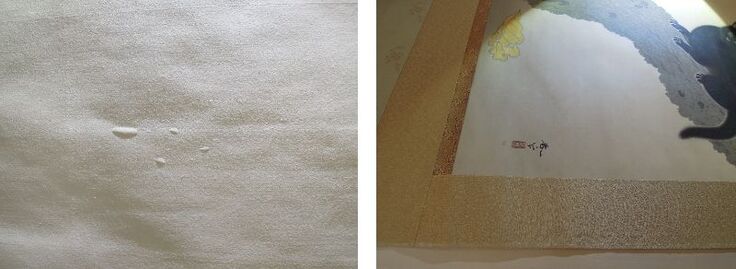 掛軸裏面に浮き(左写真)が見られるほか、本紙にシミ(右写真)、表具全体にたわみや反りがあり、修理が必要な状態でした。
