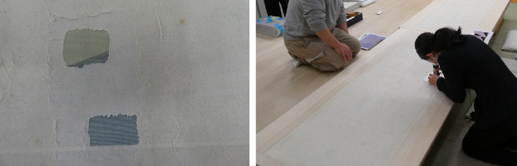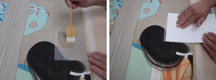 写真左:クリーニング① 膠(にかわ)を水で溶かし、化学繊維紙の上から塗る。 写真右:クリーニング② 浮いてきた汚れを、吸い取り紙に写し取る。