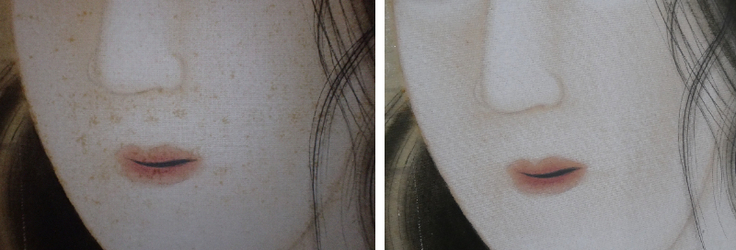 これらの作業によりシミが緩和・除去され、作品本来の鮮やかな色味がよみがえりました。