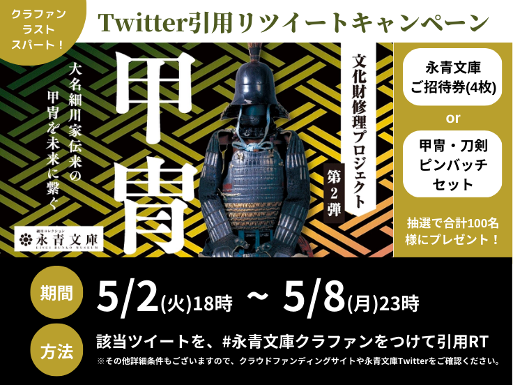 終了まで残り6日。引き続きご協力のほど何卒お願い申し上げます。 - ご参加いただいた皆様から抽選で、本プロジェクト返礼品の中から「永青文庫ご招待券(4枚綴り)」または「甲冑・刀剣ピンバッチセット」各50名様(合計100名様)にプレゼントいたします!