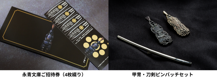 ご参加いただいた皆様へは、プロジェクトとしてのお礼に今回の返礼品の中から「永青文庫ご招待券(4枚綴り)」または「甲冑・刀剣ピンバッチセット」各50名様(合計100名様)を抽選でプレゼントします。