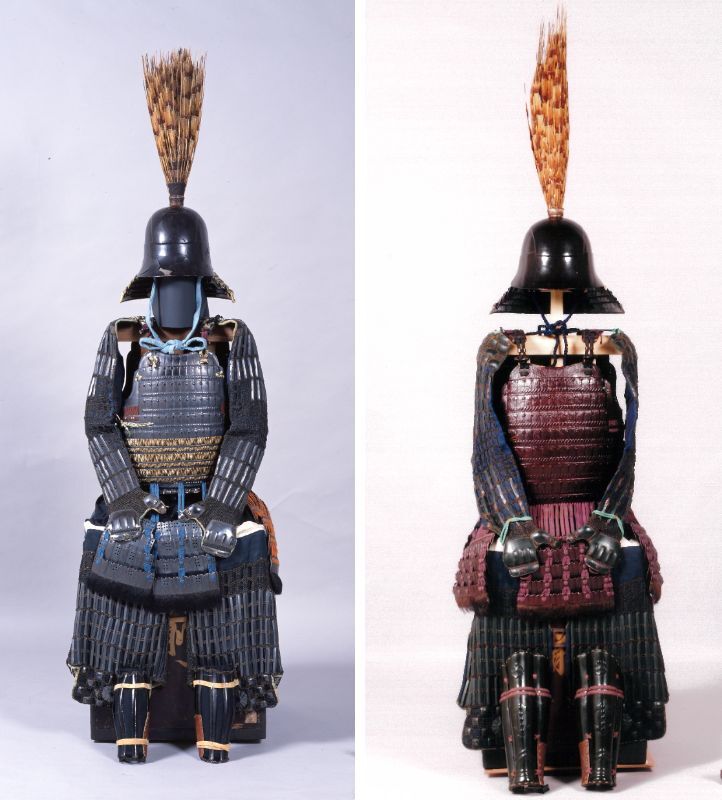 写真右: 「栗色革包紫糸威二枚胴具足」(細川光尚所用) 江戸時代(17世紀)