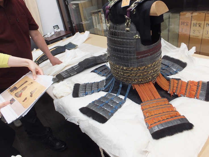 皆さまのご支援をもとに、「銀札啄木糸射向紅威丸胴具足(ぎんざねたくぼくいといむけくれないおどしまるどうぐそく)」と「栗色革包紫糸威二枚胴具足(くりいろかわづつみむらさきいとおどしにまいどうぐそく)」の修理に着手しました。