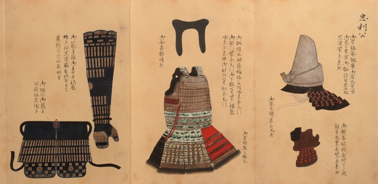 現在の草摺(くさずり)部分の威糸は欠失が多く、わずかに残る縹色の糸も後補であり、本来の姿ではありません。そこで、細川家の武具を描いた「御甲冑等之図」(文政11年〈1828〉)を参考にしながら、本来の啄木糸(たくぼくいと、色糸を交えて組んだ糸)を再現し、威糸を付け替える予定です。