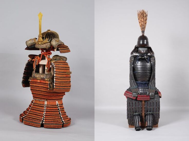 写真右:「黒糸威横矧二枚胴具足」(細川忠興所用) 安土桃山時代(16世紀)