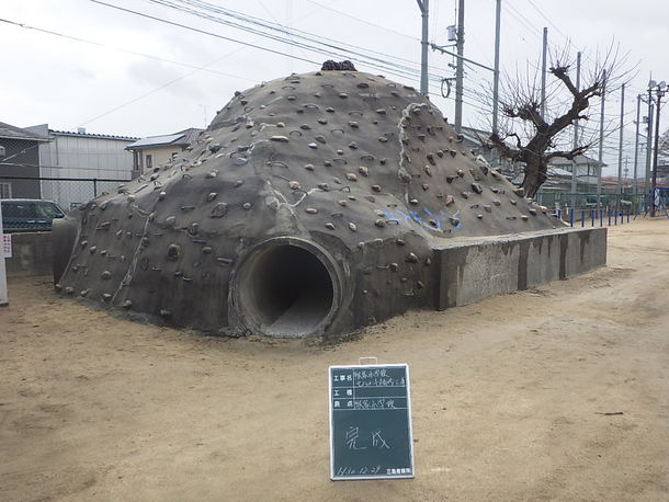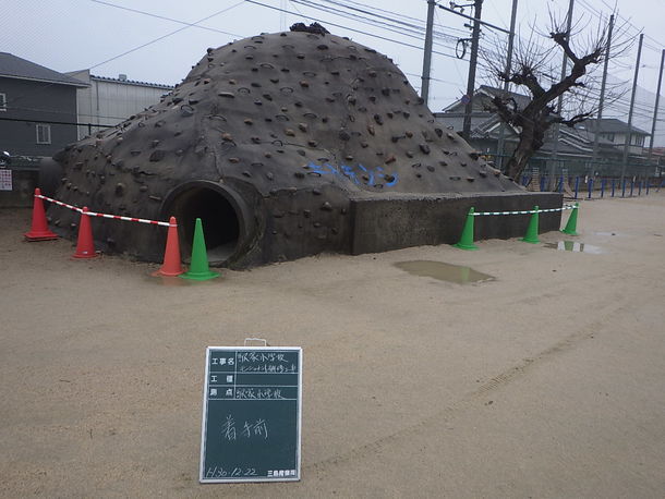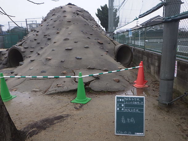 作業員の方は,「初日の作業では,土のうを運ぶのが大変でした。早く子どもたちが喜ぶ姿が見たいです。」と雪が降る中でしたが,丁寧にコテを使って修復作業にあたられていました。