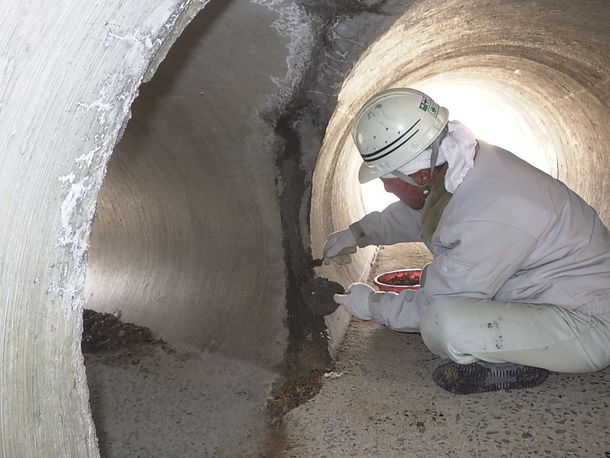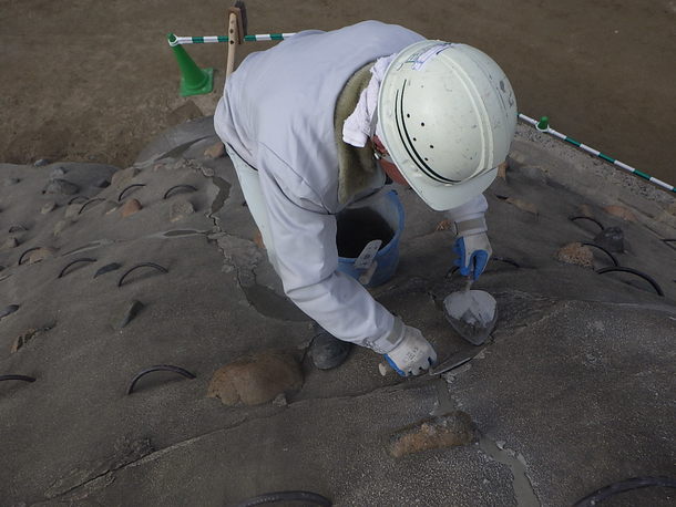 工事最終日となる12月29日は,無数の亀裂を1箇所ずつコテを使ってモルタルを塗る作業を実施しました。