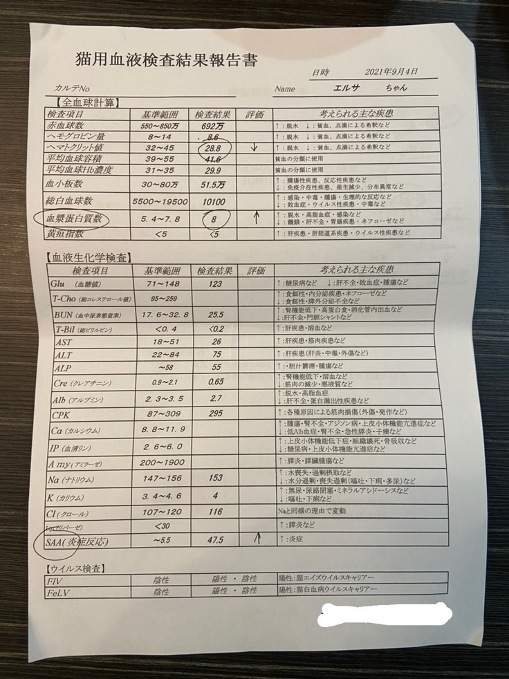この時、高熱、下痢、お腹にリンパの腫れがあることと、検査結果の数値から「猫伝染性腹膜炎(FIP)ドライタイプの初期」である可能性が高いと告げられました。