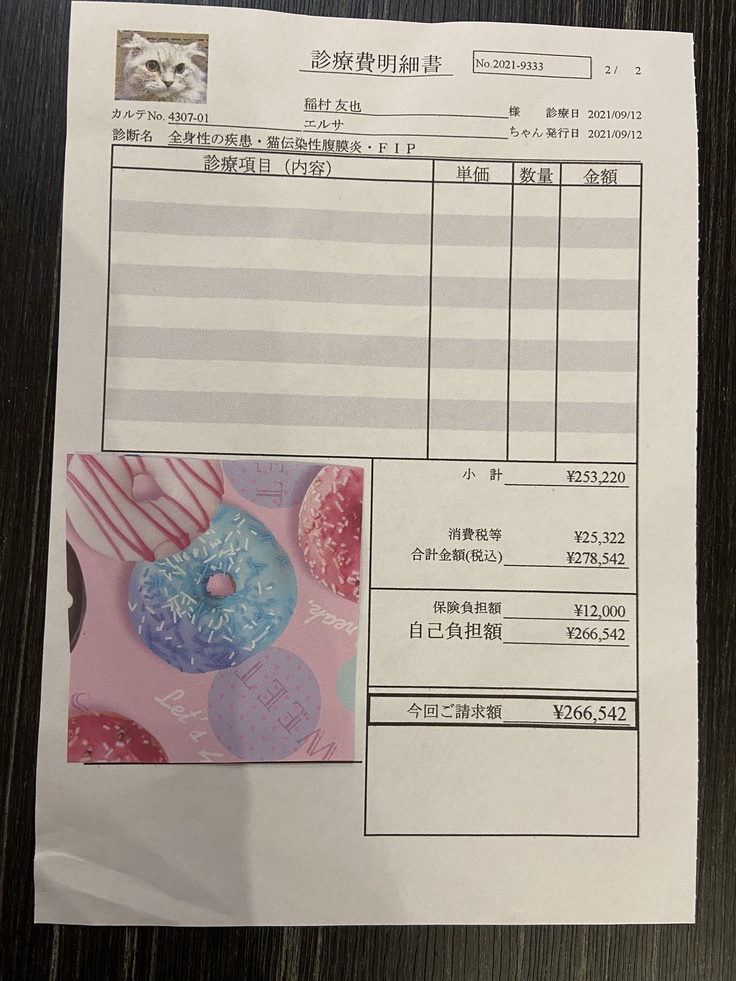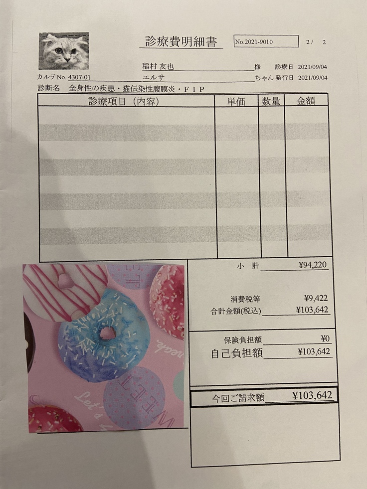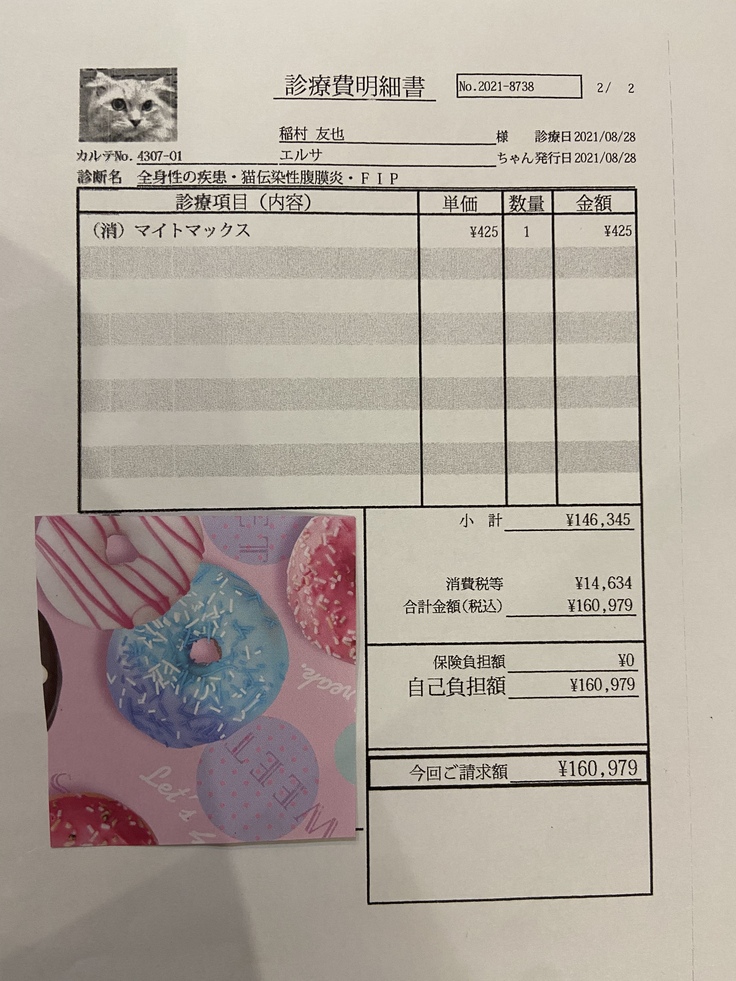 またエルサを助けたい一心で開始した未承認薬を使った動物保険の適用外の投薬治療は先にも申し上げました通り、大変高額な出費となり、私も想定外の事態で即座に費用を捻出出来ず申し訳なく恥ずかしい気持ちでいっぱいです。