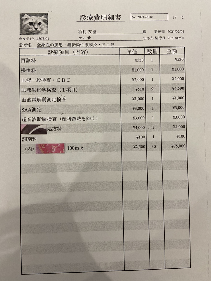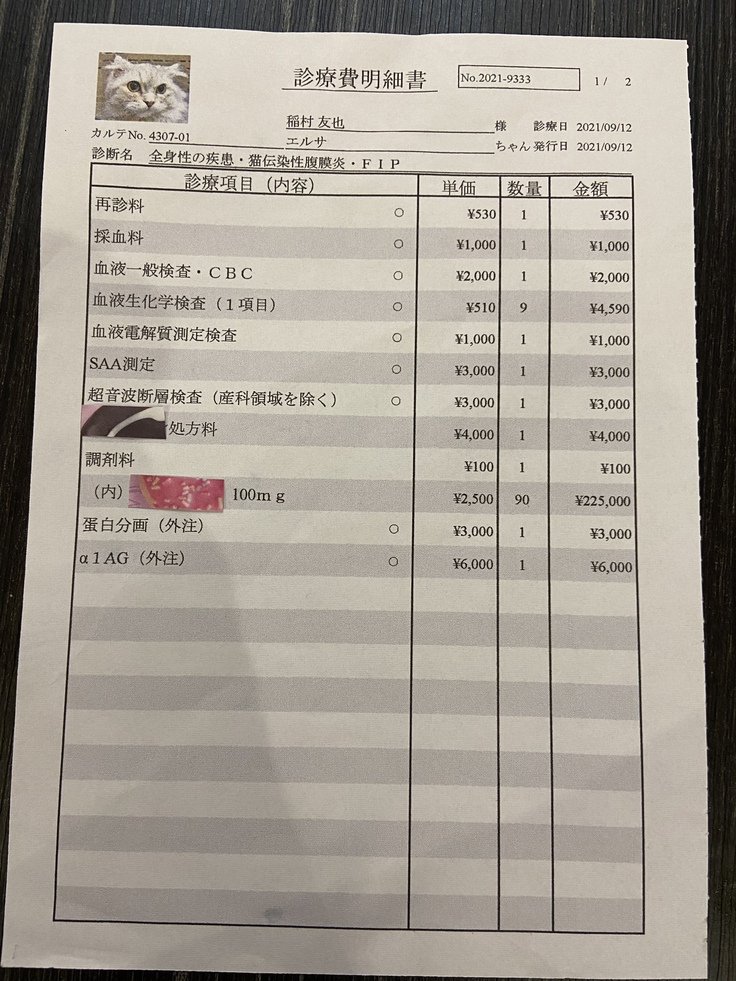 猫伝染性腹膜炎(FIP)ドライタイプ初期の治療(投薬)のため、唯一症状の回復、寛解が見込まれる未承認薬84日間の投与。および経過観察の後、最終検査まで。