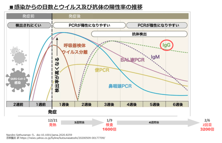 感染後の抗体価の推移や、PCR検査での検出の推移です。