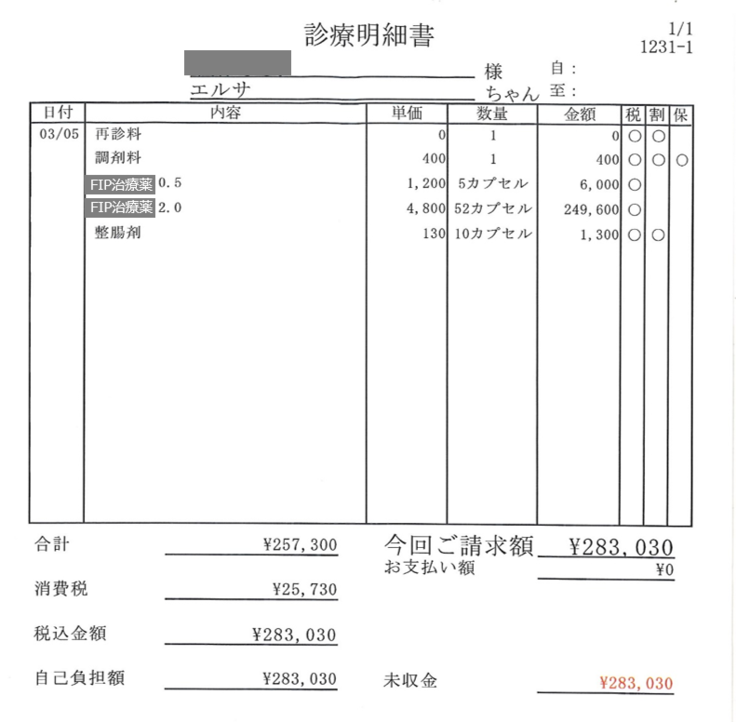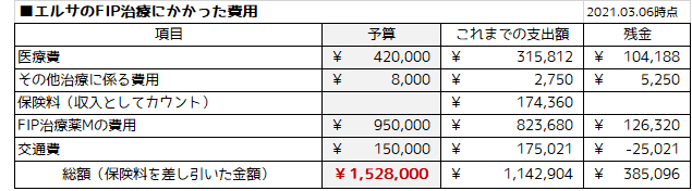 これまでにFIP治療にかかった医療費の内訳になります。
