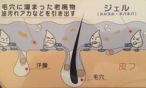 「ジェル」は、皮膚表面にある角質層の健康状態を改善し、洗う事で古い角質を取り除きます。また高い保湿性があるので、皮膚に潤いを与え、老化を予防する働きがあります。「ジェル」のヌルヌル、ネバネバは吸着性があり、「ジェル」でマッサージする事により毛穴に溜まった老廃物、アブラ汚れ、アカなどを抱え込んで引き出してくれるため、みずみずしい素肌がよみがえってきます。