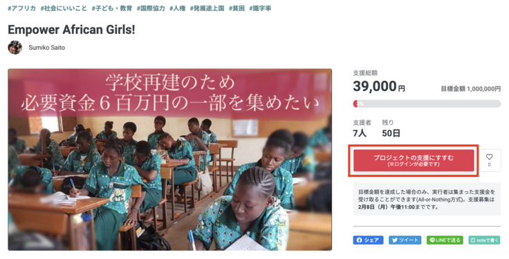 You can go to the login page by clicking the プロジェクトの支援にすすむ button.
