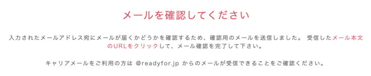 You will see the screen below and you will receive an email from Readyfor (no_reply@readyfor.jp) to ask you to verify your email address.