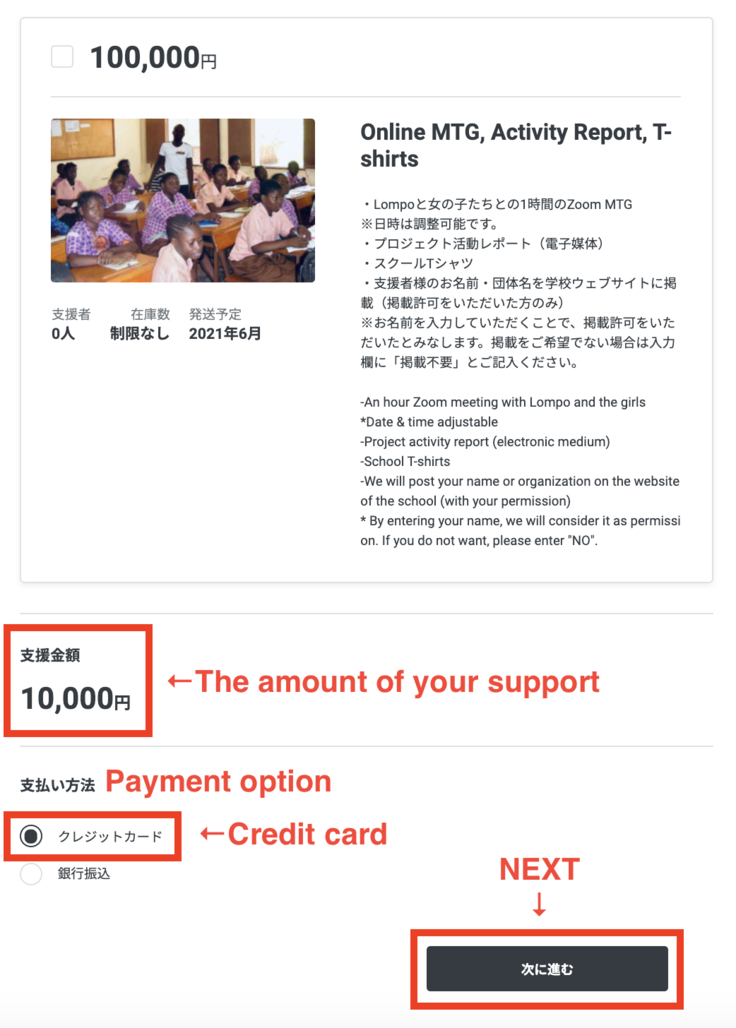 Please scroll down and you can see the amount of your support at the bottom of the page. If there is no problem, please choose the payment method (Credit card) and go to the next page by clicking 次に進む .