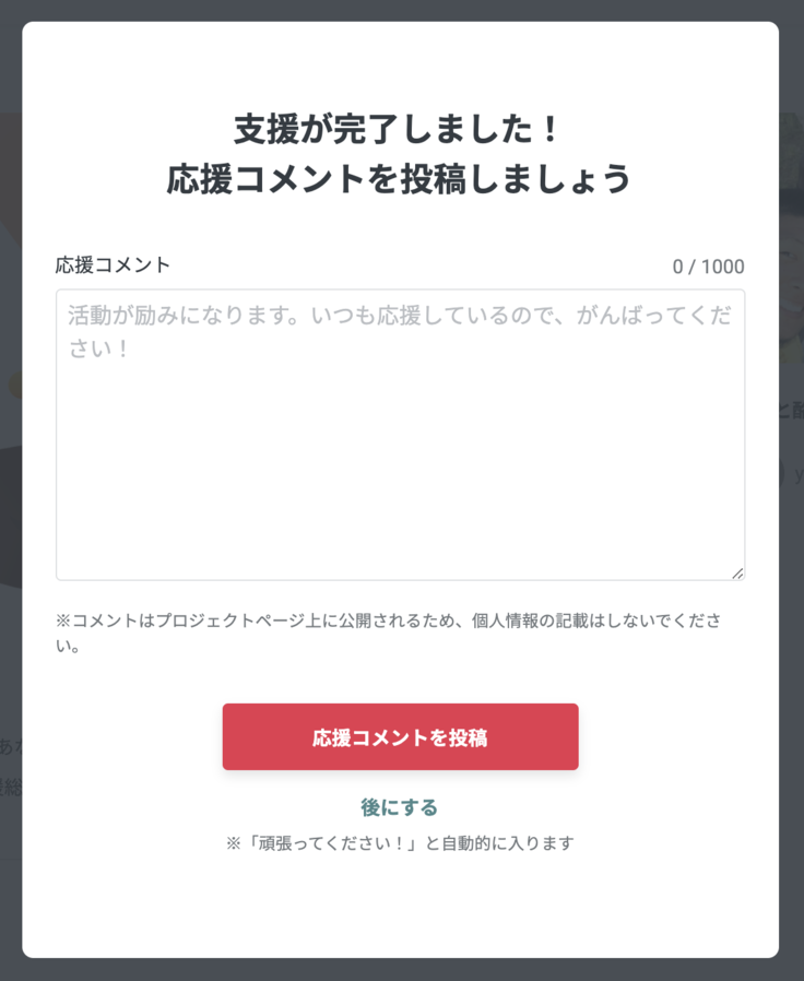 After you complete your donation, you will see the following screen. Please write your message and click 応援コメントを投稿 to post, and we will reply to your message!
