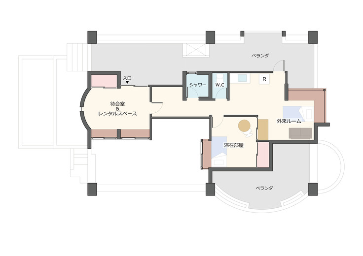 お部屋は、「待合室&レンタルスペース」「外来ルーム」「滞在ルーム」の3つあり、さらにキッチン、トイレ、シャワー室を設置します。