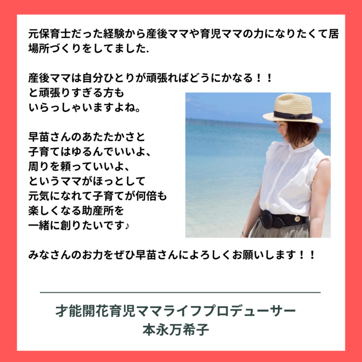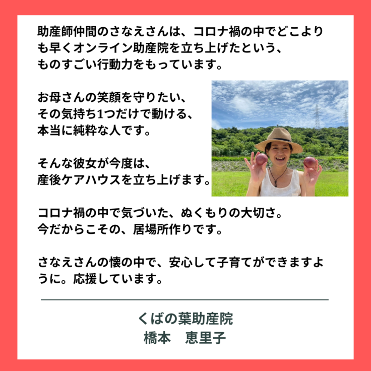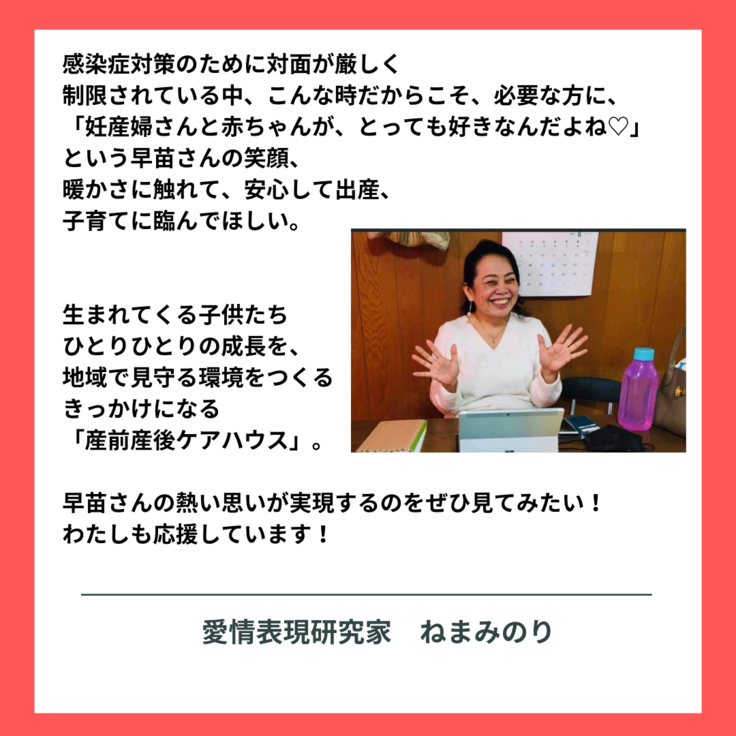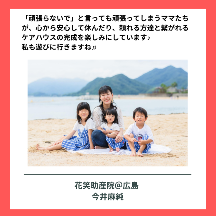 お寄せいただいた応援メッセージの一つ一つを読ませていただいて、皆さまの産後の女性に対する優しい気持ちや、子どもたち幸せな未来を願う熱い想いに触れ、とても心を打たれました。