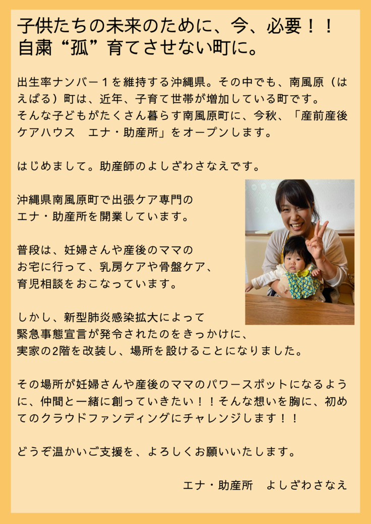 そんな状況の中、ママたちと繋がりがもてるように、うちなー助産師.comでも支援をしてはいるものの、オンライン支援では孤立感を拭えるような関係を築くことが難しい方もいて、限界を感じることもあります。
