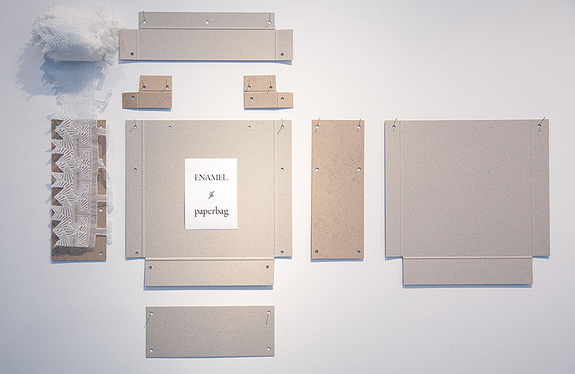 紙を扱うことが多いグラフィックデザイナーと資材系素材に触れることが多いバッグデザイナーのユニットからなるenamel. なので、この紙にたどり着くというよりも探していたものに出会った、という感じで制作に入りました。