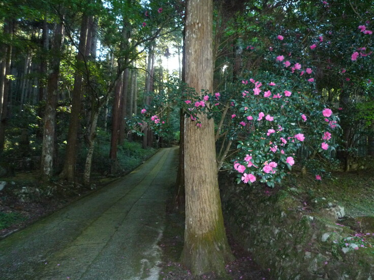 昼間でもうっすら暗い参道にサザンカが拝観される皆さまを迎えてくれます。聞こえる音と言えば チョロチョロと流れる山谷川の“せせらぎ”のみです。深呼吸を何度もしたくなりますょ もみじもそろそろ色づいてきました。とっても素敵な季節です。是非お越しください
