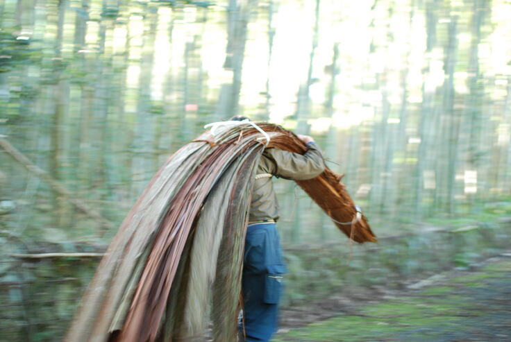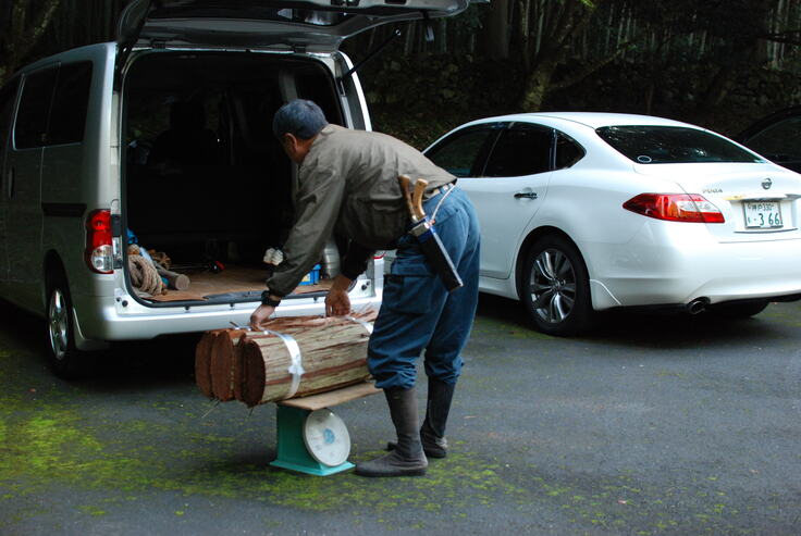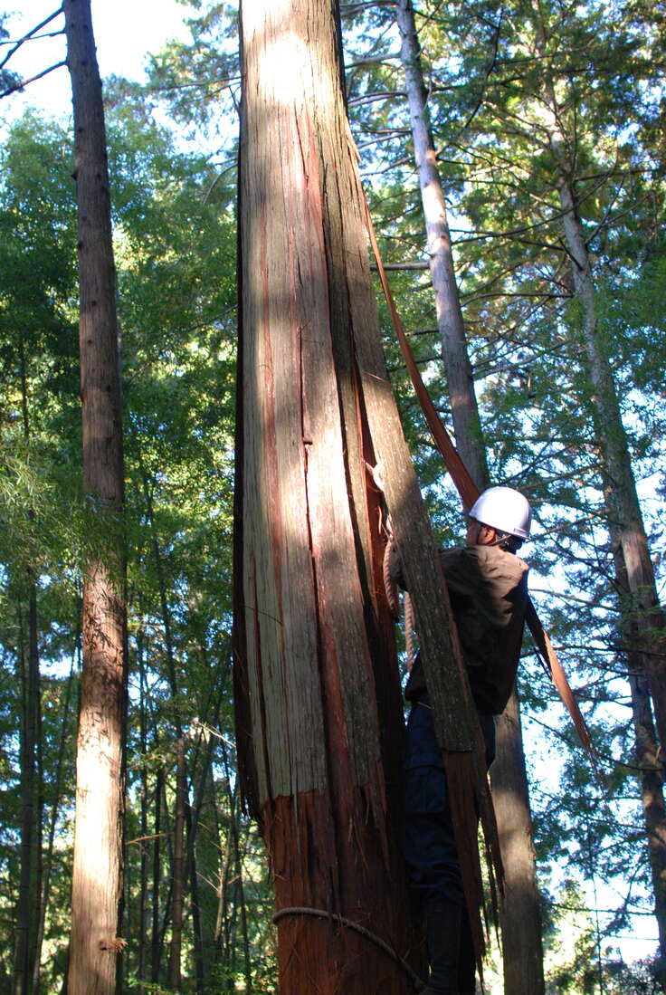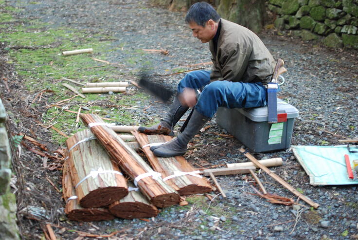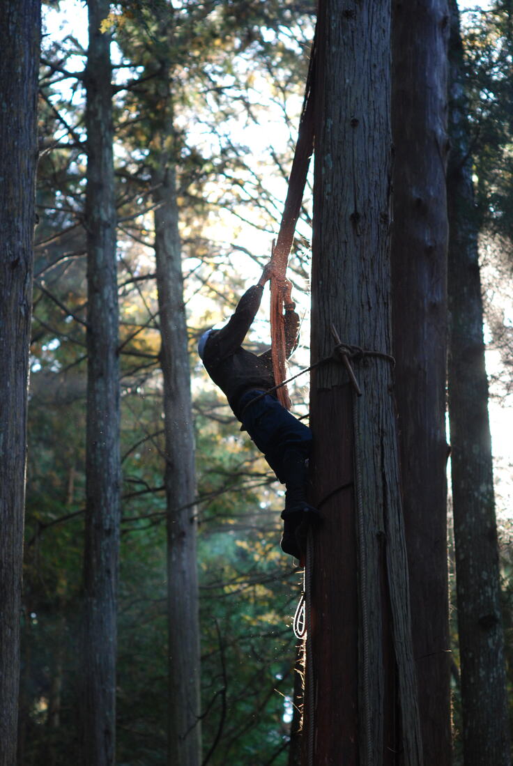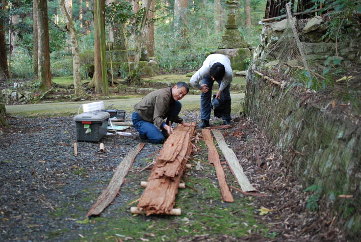14日 慧日寺参道にて檜皮葺き採取実演会 もっと見る〉をクリック