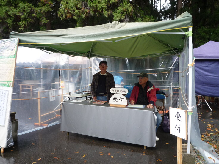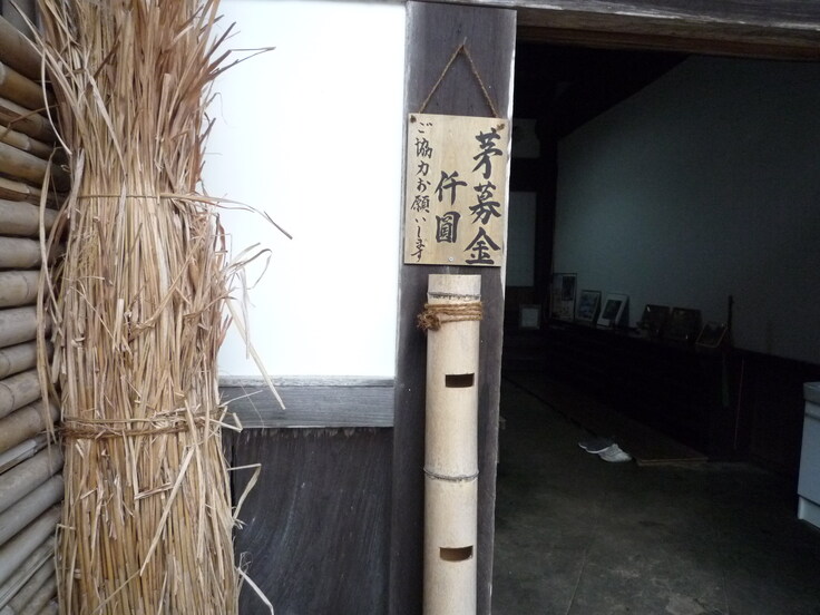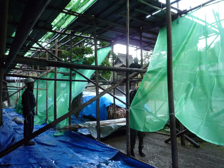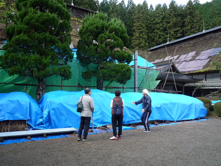 小雨でシートをかけてますが茅葺きの説明もしています。