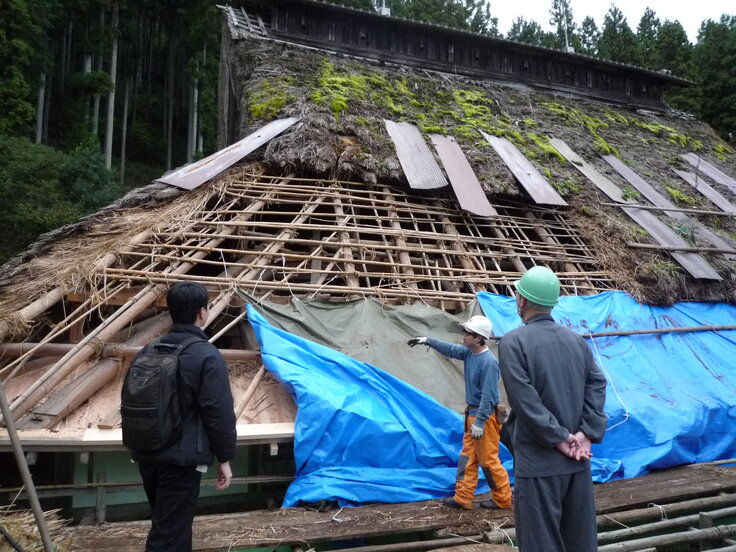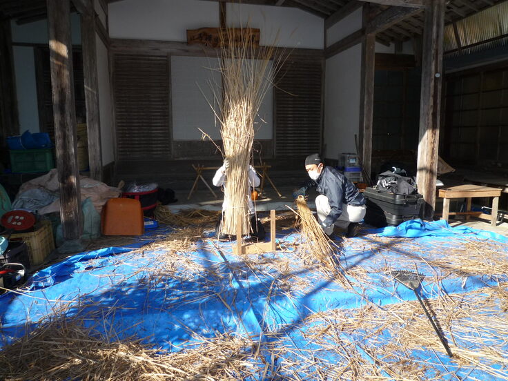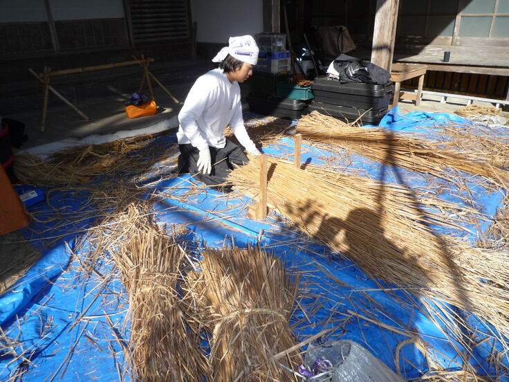 屋根裏の様子が見えて来ました。取材に来られた記者さんに説明をして頂きました。作業場所により長さを揃えて束ね屋根に上げていきます。
