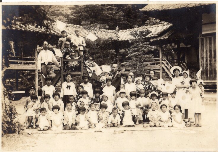 慧日寺 疎開児童受入写真・中央の方が先々代 門脇舜幢住職・甲南小学校3年~6年生もっと見る〉クリック