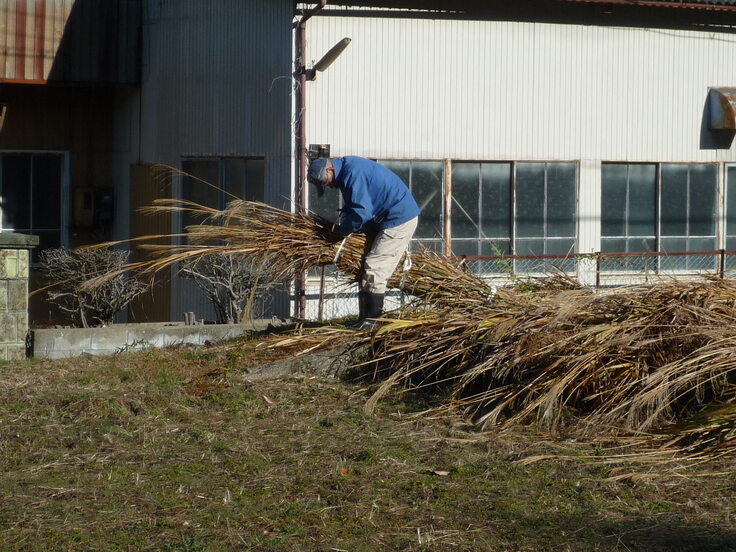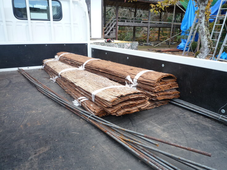 スギ皮到着。箱棟から落ちてくる雨が茅に当たると劣化が早くなりますから、そこにスギの皮を入れて劣化を防ぎます。