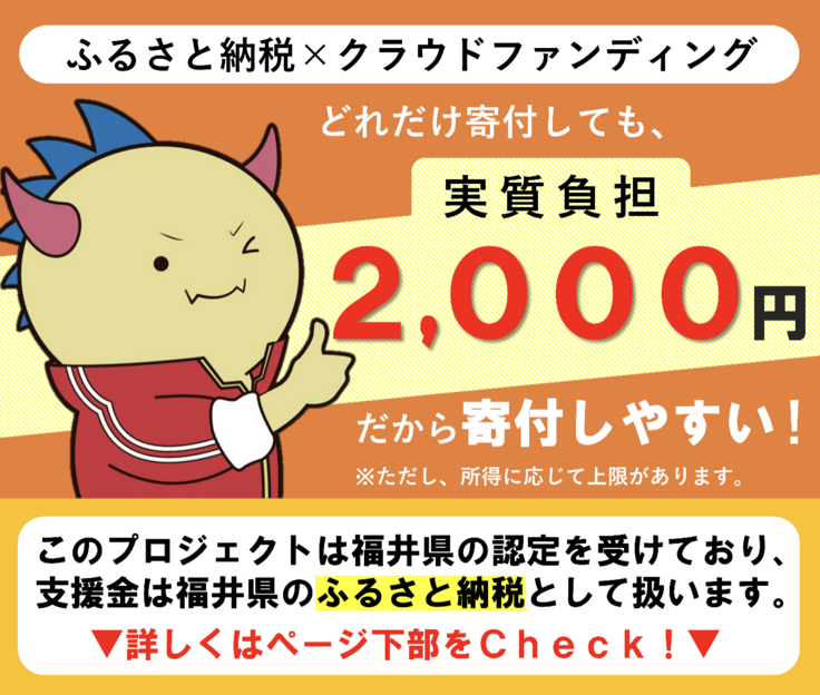 本プロジェクトは福井県の「ふるさと納税を活用した新事業創出支援事業」に認定されたプロジェクトであり、ご寄附者様の個人情報は、福井県に提供されるほか、福井県を通じて本事業者にも提供されます。この点をご了解頂いたうえで、ご寄附をお願いいたします。