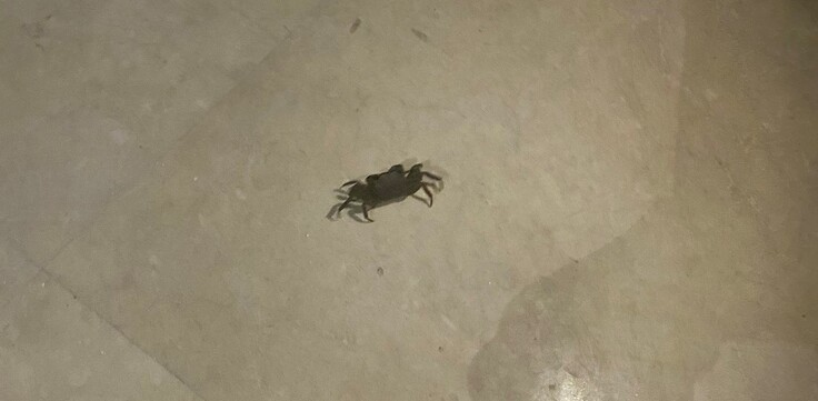 先日夜に工事中の場所を黒いものが動いているのが見えたので、ゴキブリ?と思ってライトをつけて確認したところ、どこから来たのか小さいカニが居ました。