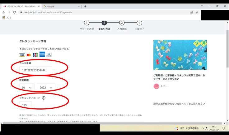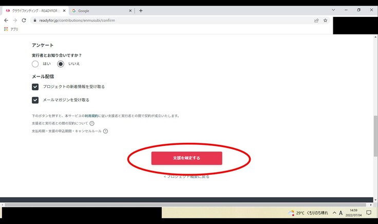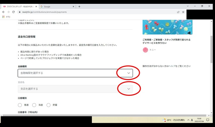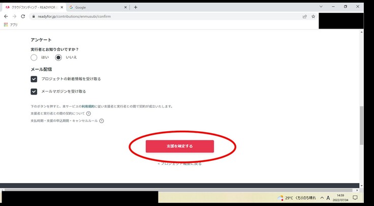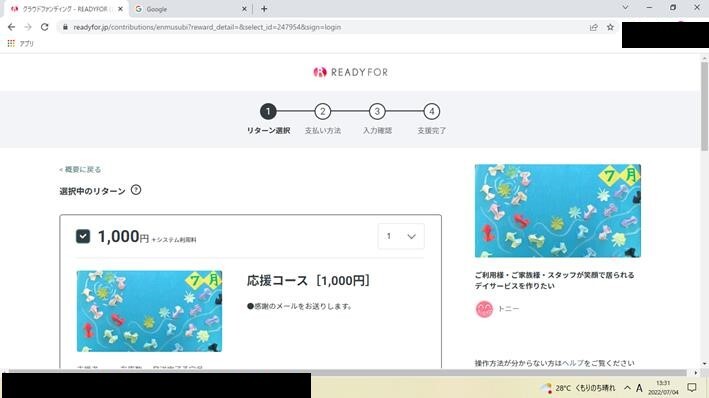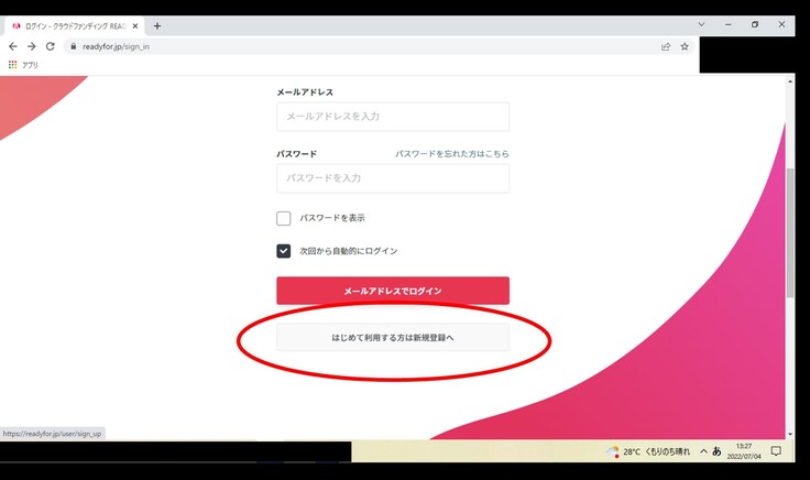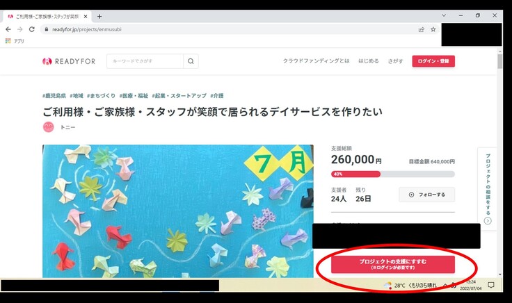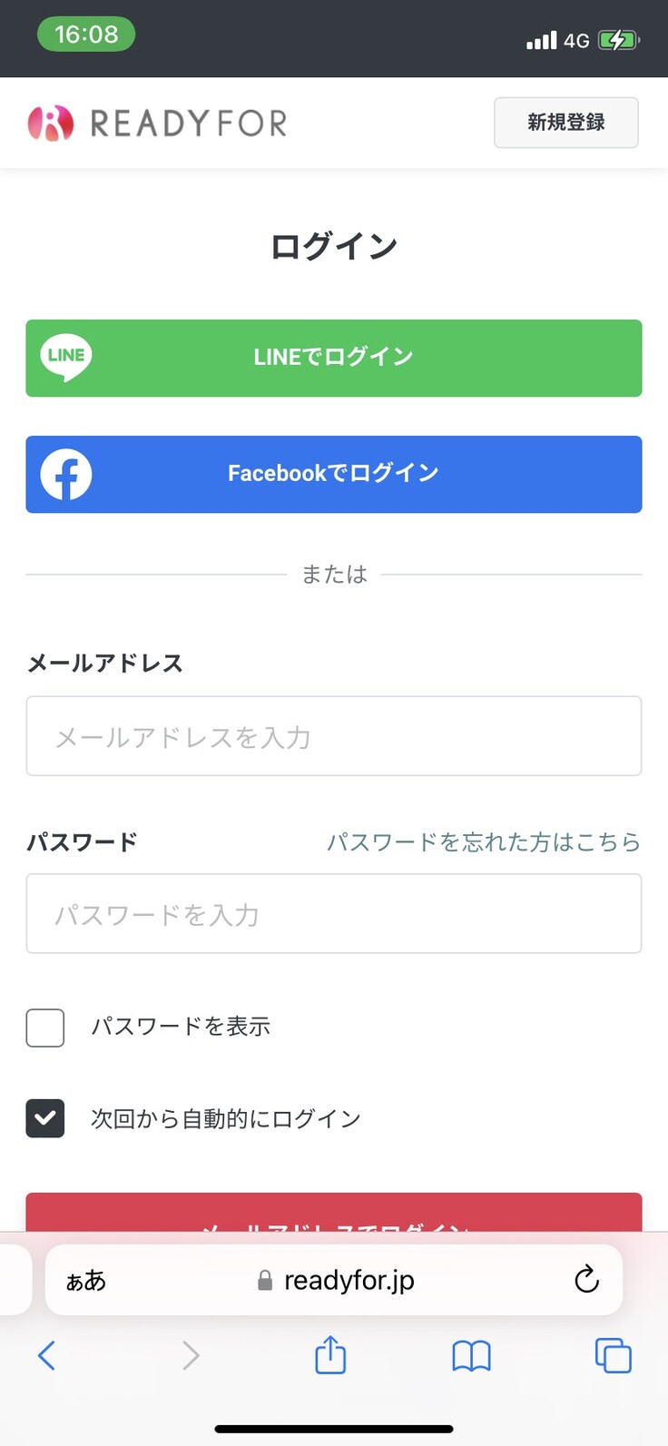 支援をするためには、まず、レディーフォーにログインした後に支援が出来ます。ラインをお持ちの方はログインが簡単にできますのでよろしくお願いします。また、お持ちでない方もメールアドレスにてログインできますのでご協力よろしくお願いします。