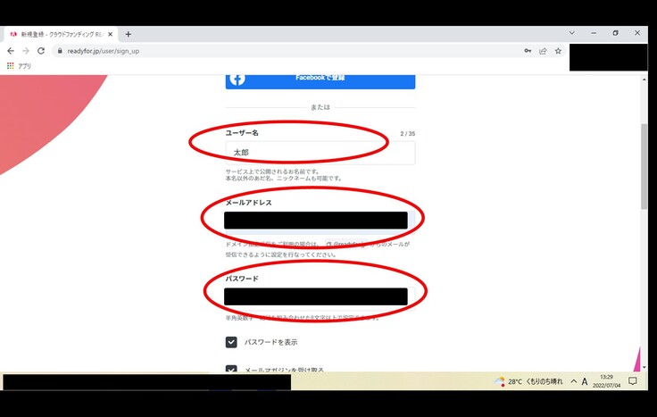 ユーザー名(氏名やニックネーム)、メールアドレス、パスワード(半角英数字を含めれば何でもよい。パスワードを自分で作ったら忘れないようにメモ等をしてください。)