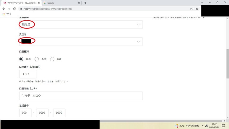 上記(鹿児島銀行の場合) 金融機関名に鹿児島 支店名入力 口座種別 口座番号 口座氏名 電話番号を入力